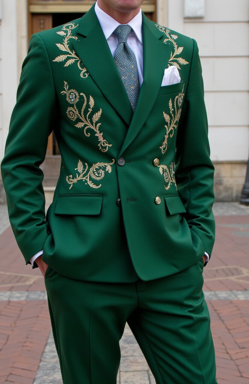 Embroidered details on a forest green suit add a touch of artistry and elegance. It’s perfect for those who appreciate craftsmanship and unique designs. The embroidery can be subtle or bold, depending on your preference.