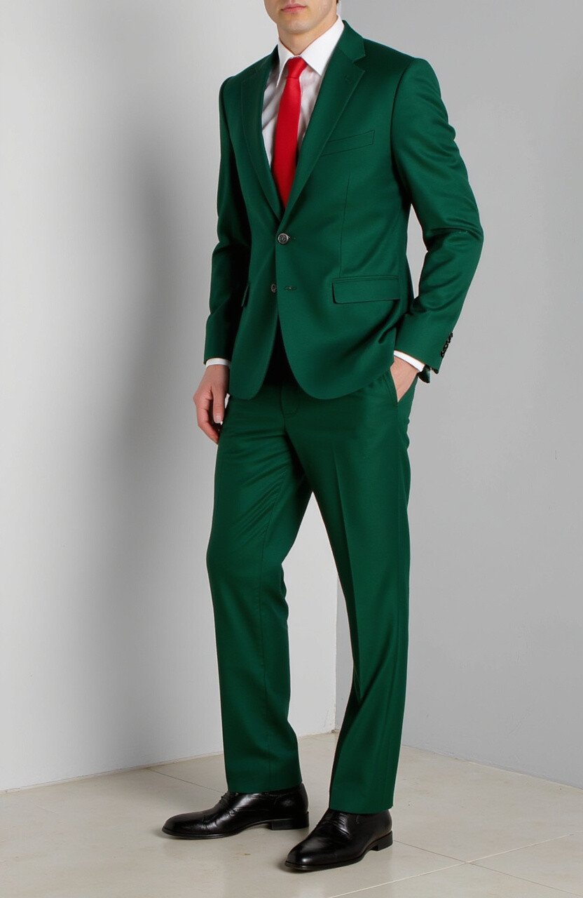 A slim fit suit in forest green offers a modern twist on a classic. It hugs the body perfectly, providing a sleek and stylish appearance. This suit is ideal for younger professionals or those with a lean build.