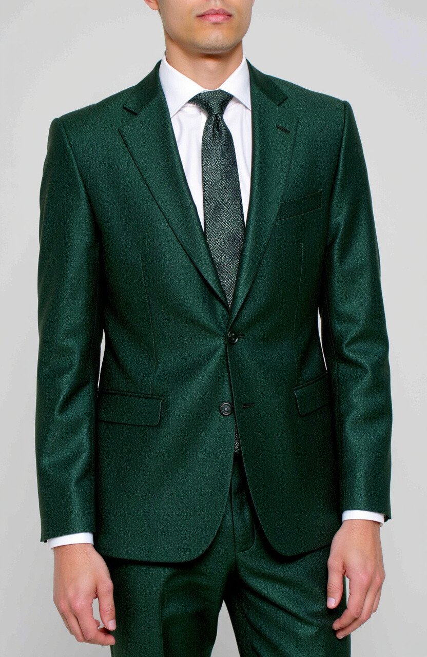 A textured forest green suit offers depth and interest, making it stand out from plain fabric suits. It’s perfect for those who appreciate subtle complexity in their wardrobe. The texture adds a tactile element to the suit.