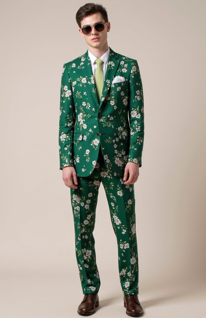 For a fresh and lively look, opt for a forest green suit with floral patterns. It’s perfect for spring or summer events where you want to embrace nature. The floral design adds a cheerful touch to the suit.
