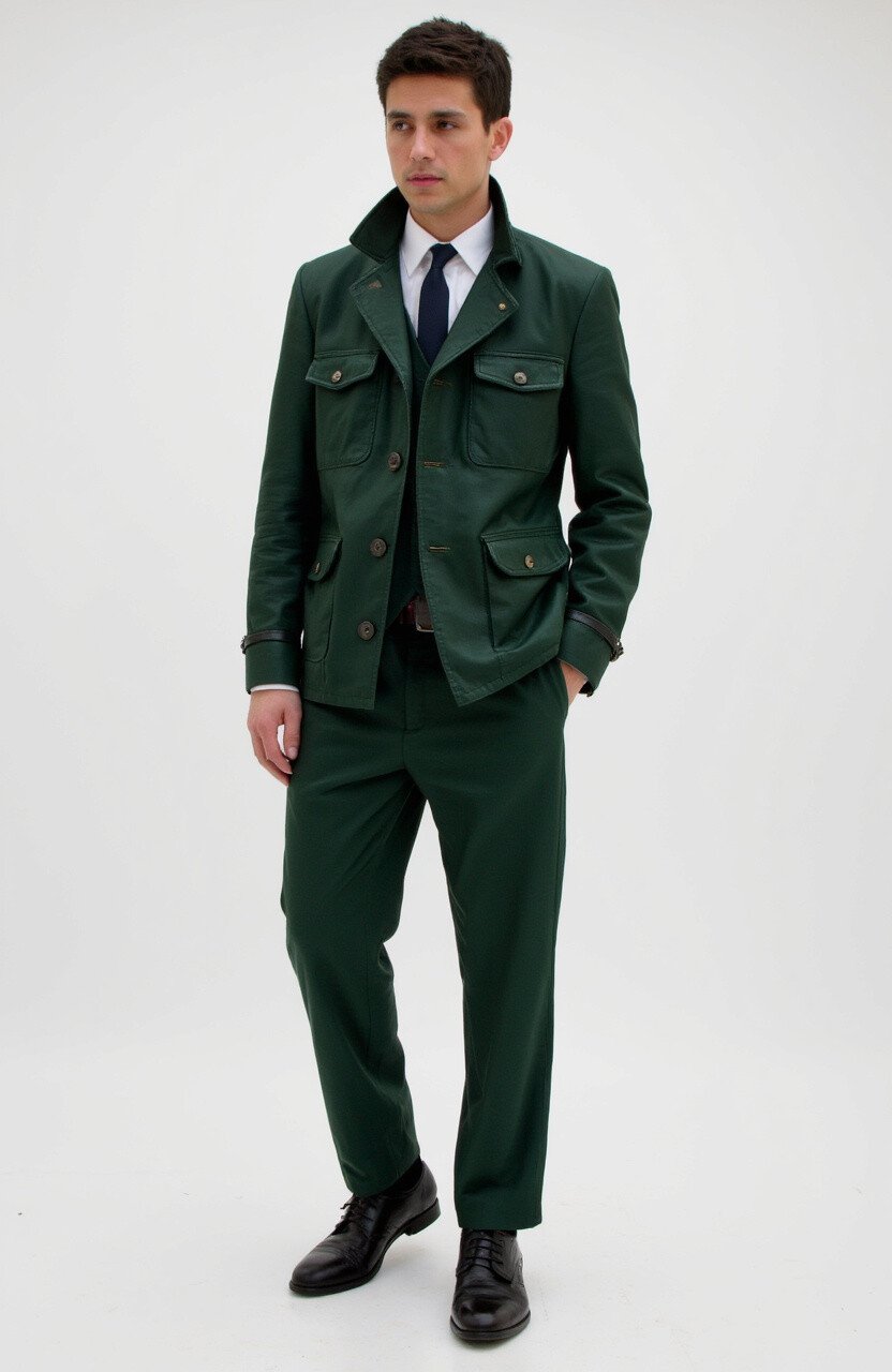 For a rugged yet refined look, opt for a forest green suit with leather accents. It’s perfect for adding an edgy touch to a classic ensemble. The leather can be incorporated in pockets, buttons, or even as a trim.