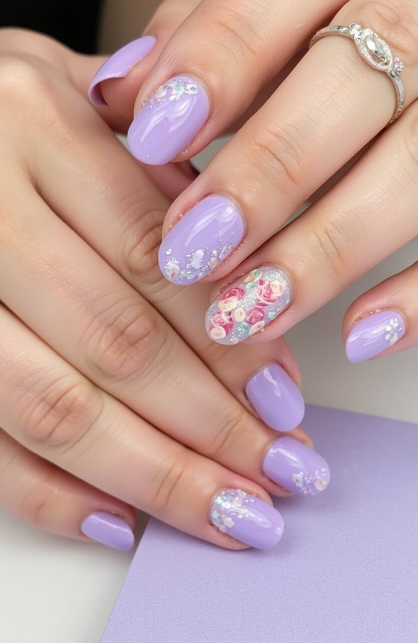 Enter a world of peace with Lavender Dream nails. Soft purples and delicate designs create a calming and beautiful look.