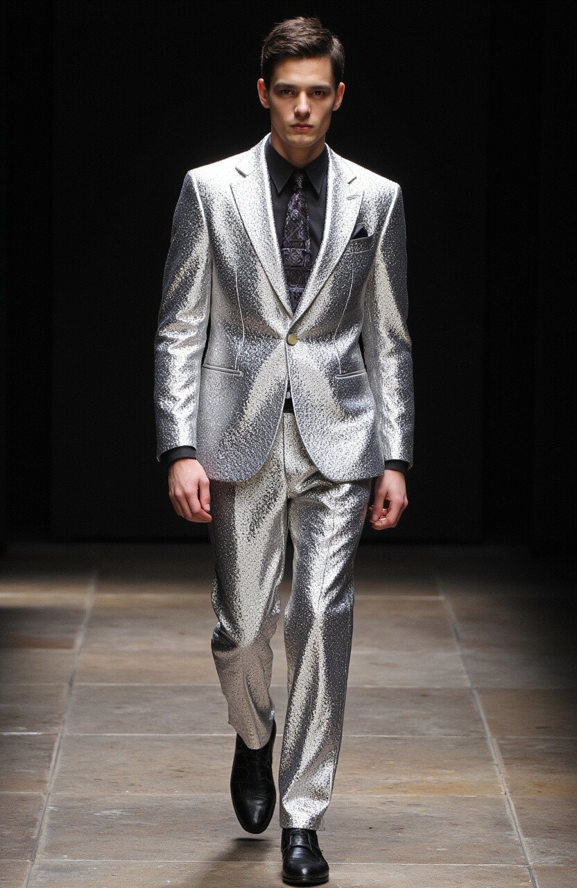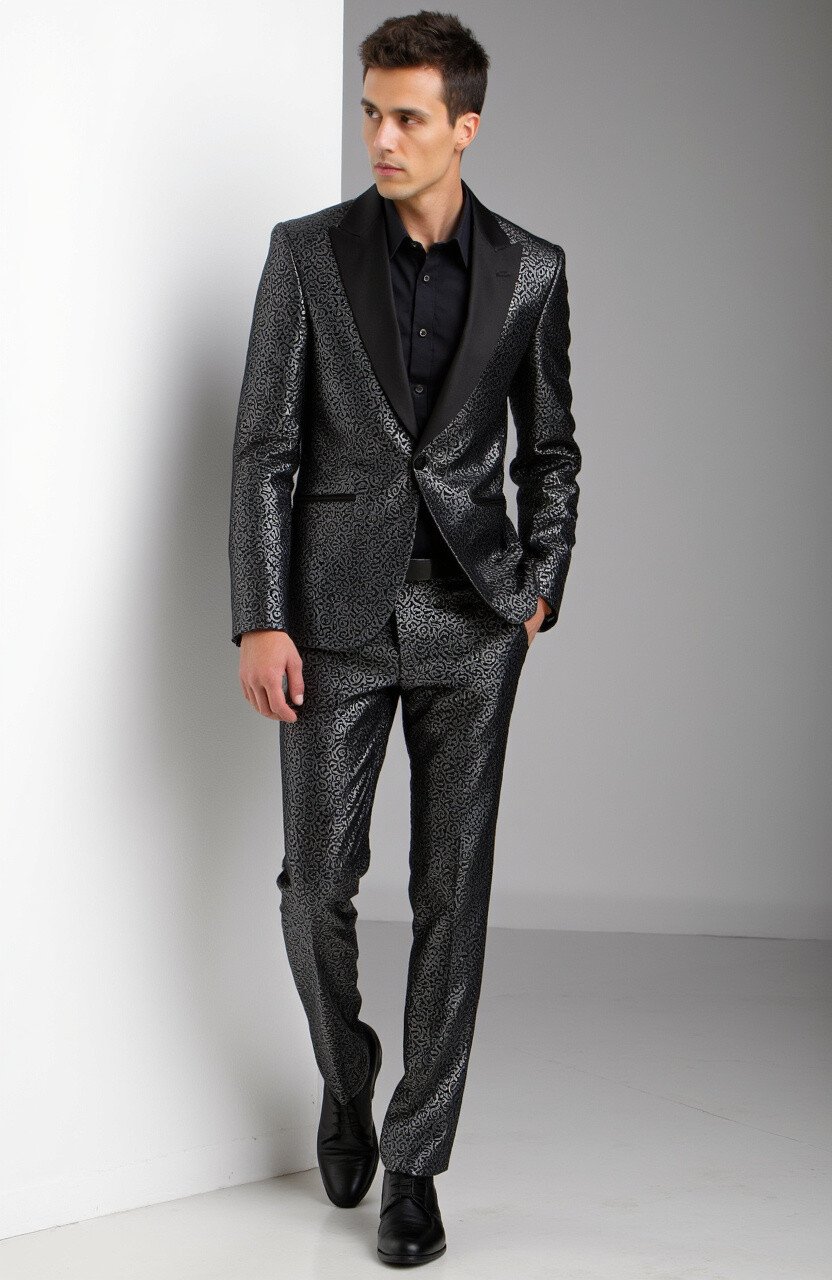 A silver and black jacquard suit offers a sleek and modern look. Perfect for evening events, this suit combines elegance with a touch of edginess.