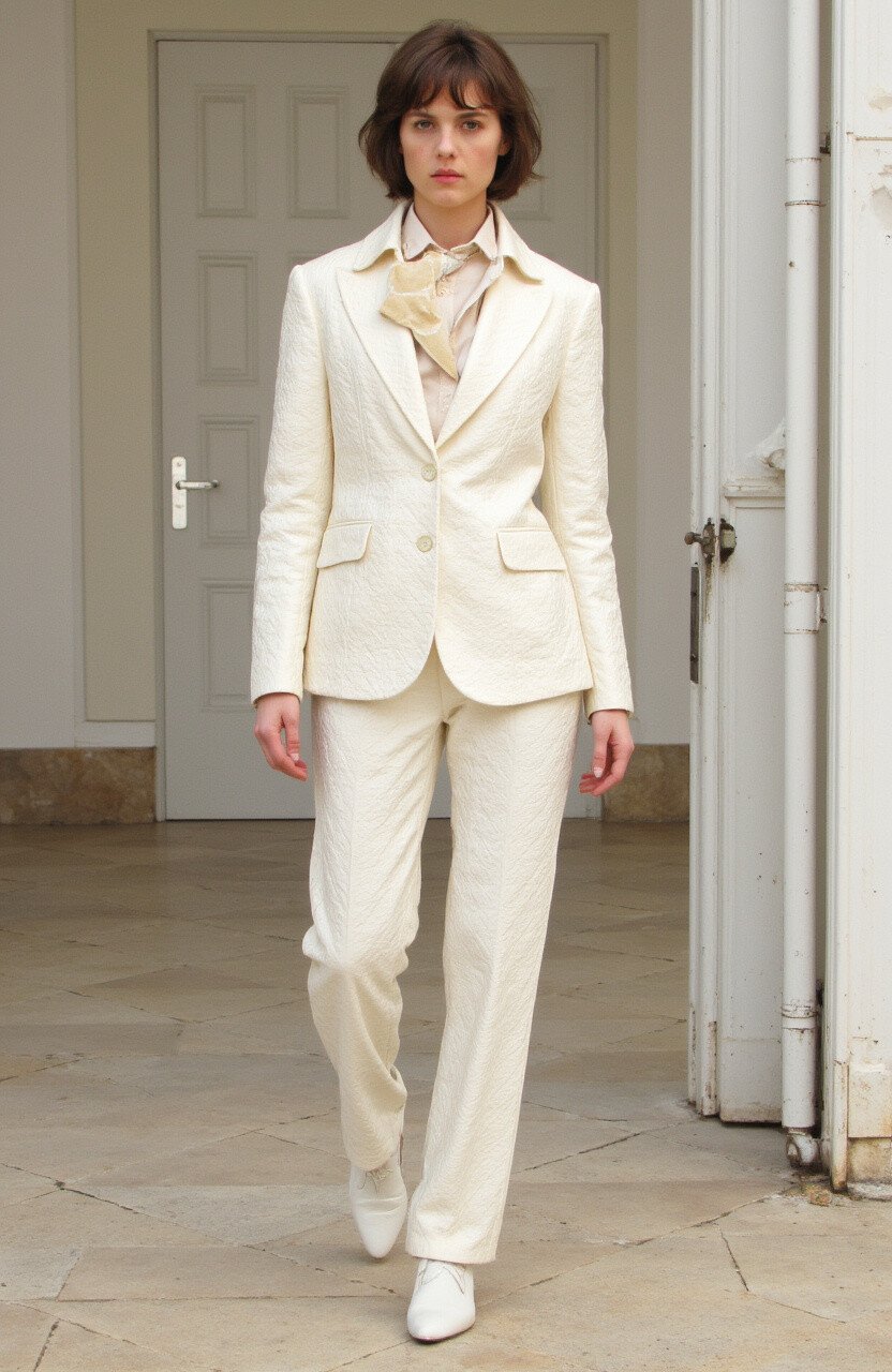 Ivory jacquard suits bring a vintage charm to your wardrobe. Perfect for weddings or special occasions, this suit offers a classic and timeless look.