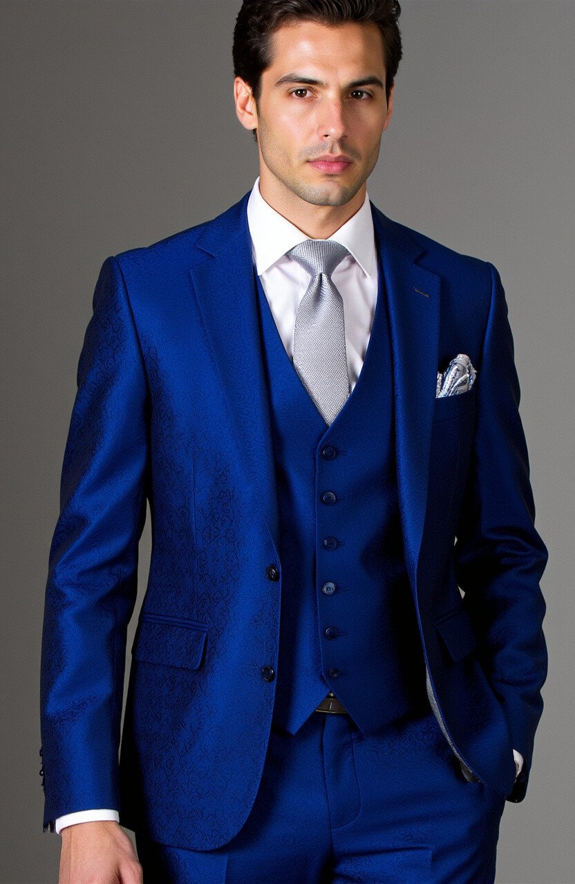 Imagine yourself in a regal blue jacquard suit that shimmers with every move. This color not only exudes confidence but also pairs well with almost any accessory. It’s perfect for a gala or an upscale evening event.