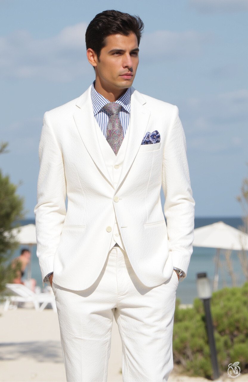 A crisp white jacquard suit is the ultimate in elegance and purity. Ideal for summer weddings or beach parties, this suit offers a fresh and clean aesthetic. It’s a blank canvas for your creativity.