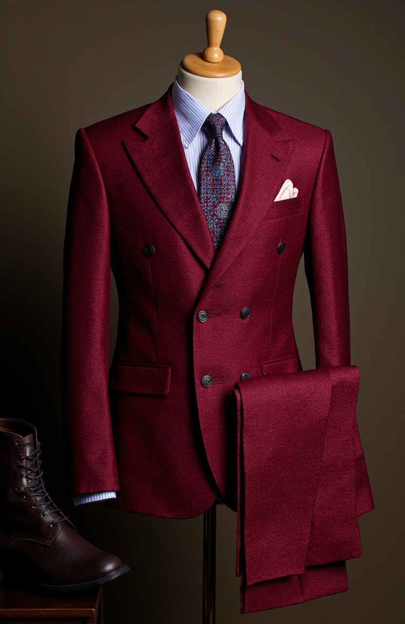 Pair with a cream or light gray shirt for an upscale finish. The cost is often justified by the timeless appeal it brings. A maroon suit is like a fine wine, improving with every wear.