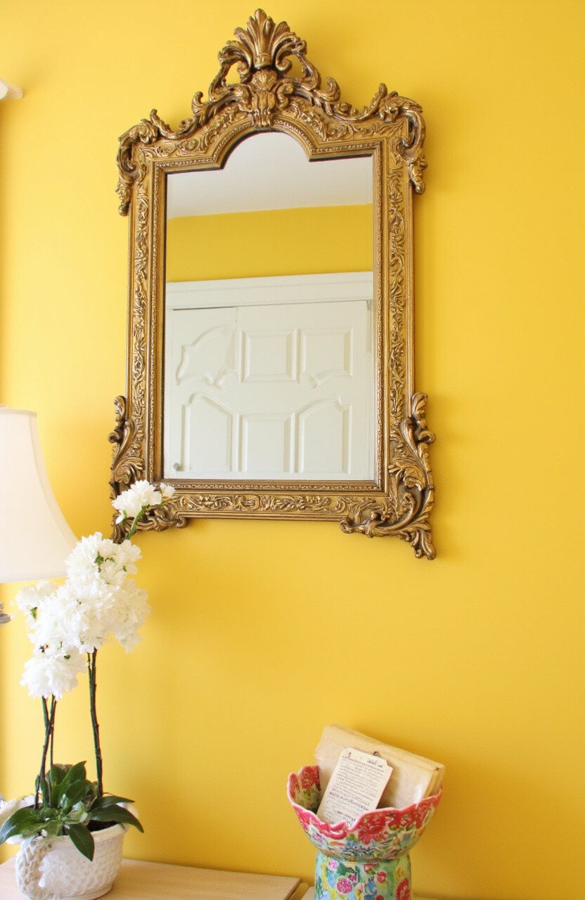 A yellow-framed mirror can be both functional and decorative. It reflects light and adds a cheerful touch.
