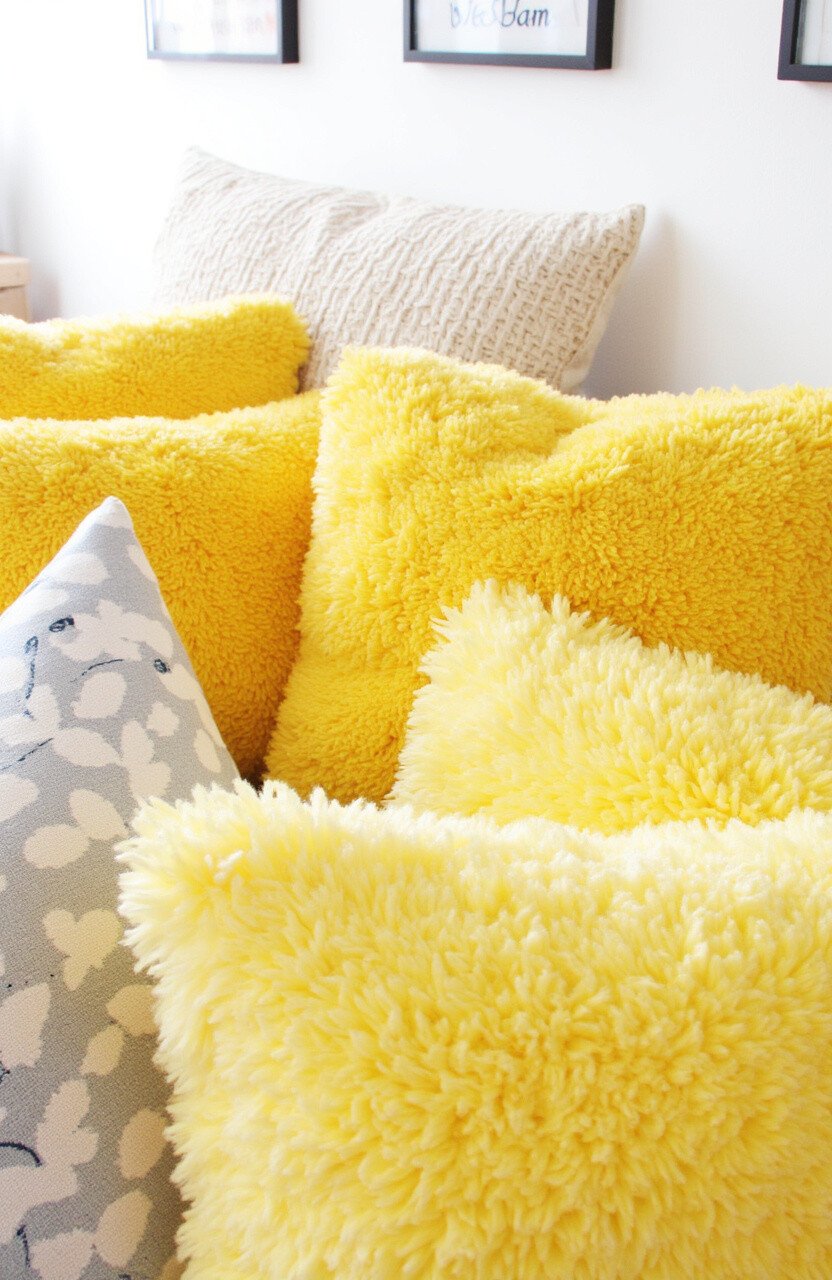 Imagine sinking into your couch surrounded by fluffy yellow pillows. They’re like little rays of sunshine you can hug. Mix different shades and textures for a playful effect.