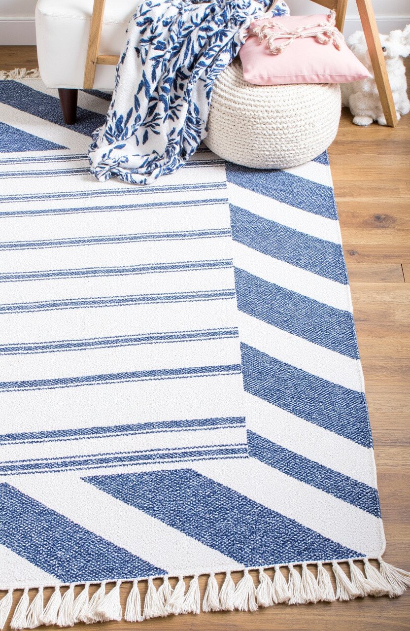 A navy blue striped rug can anchor a room, pulling together various elements and adding warmth. It’s like art for your floor, and it guides the eye through your space.