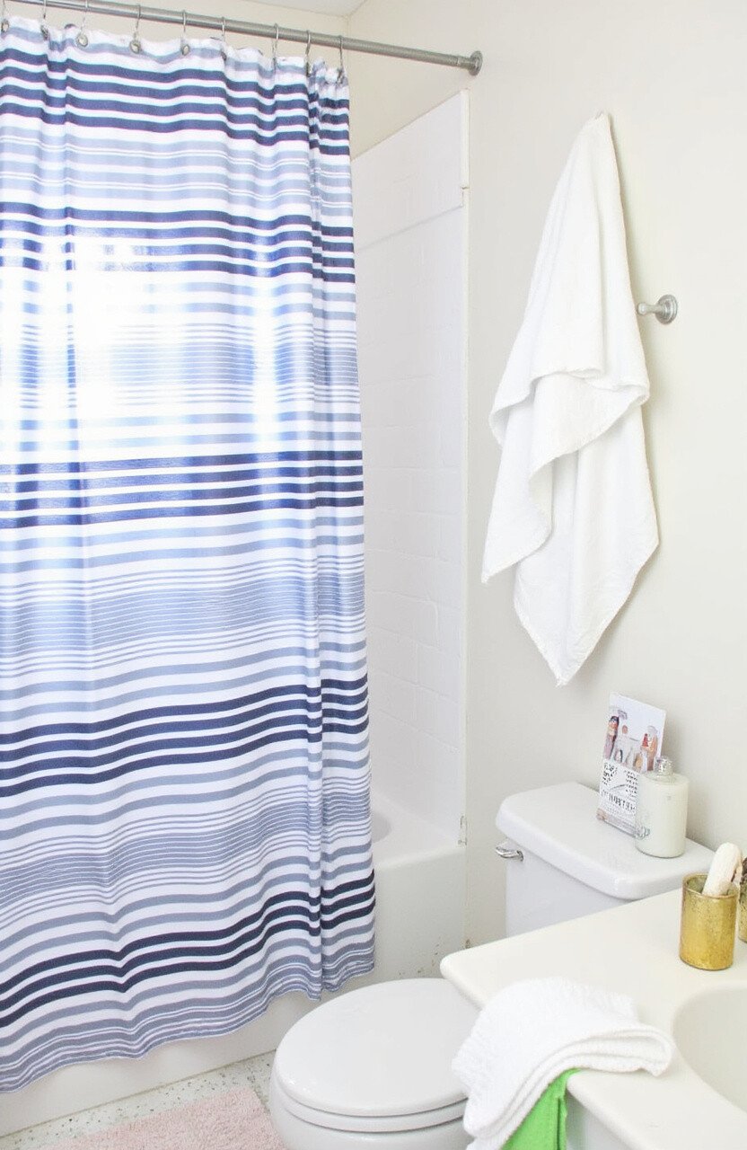 Bring a splash of style to your bathroom with a navy striped shower curtain. It’s like giving your bathroom a quick makeover.