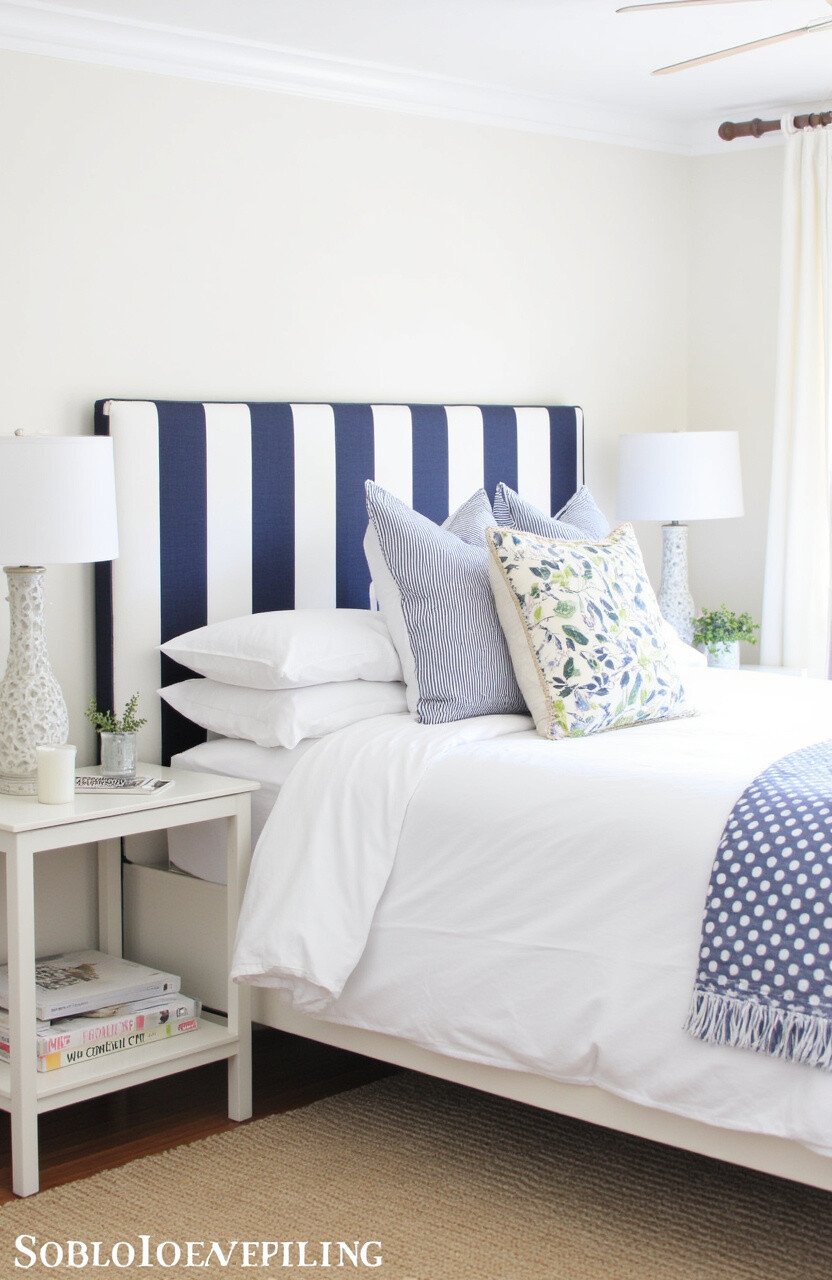 A navy striped headboard is a striking addition to any bedroom. It serves as a focal point, drawing attention and adding sophistication.