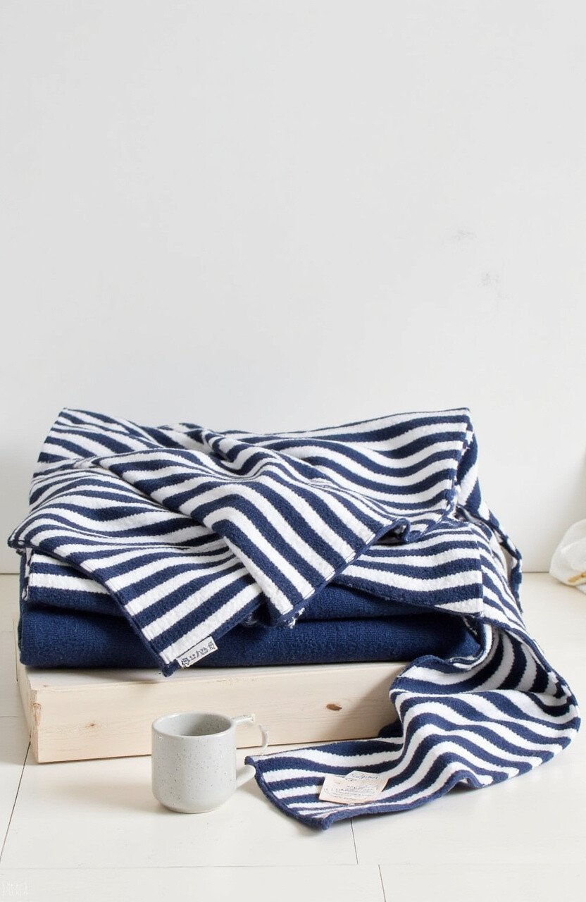 A navy striped throw blanket is both functional and stylish. It adds warmth and texture to any room.