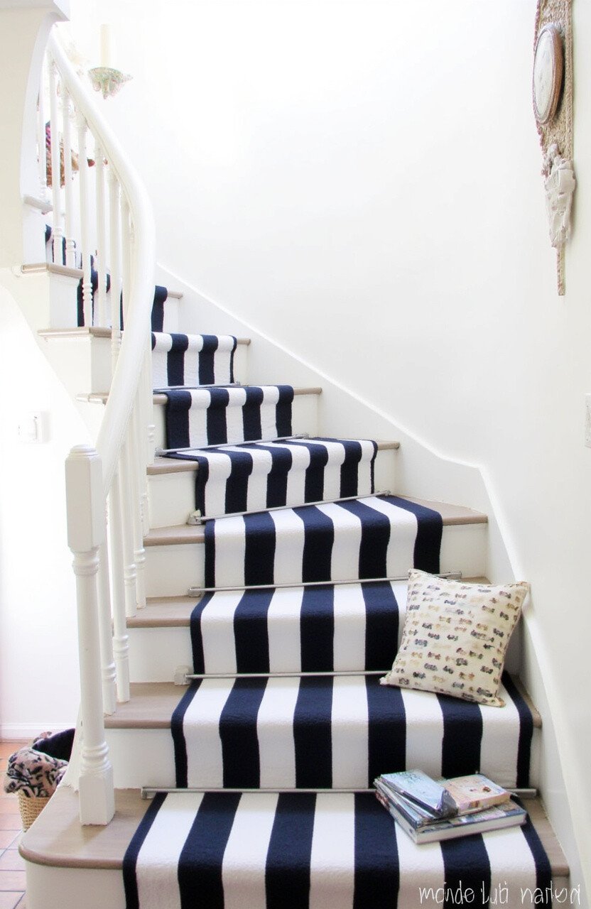 Make a statement with a navy striped stair runner. It adds drama and elegance to your staircase.