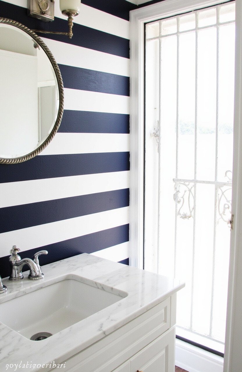Wallpaper with navy stripes is an elegant way to create interest on your walls. It’s perfect for a feature wall or a small space like a powder room.
