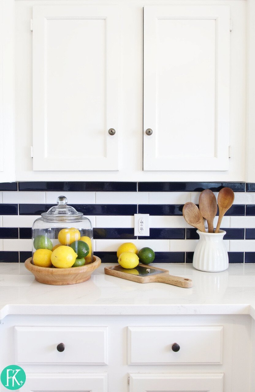 A navy striped backsplash in the kitchen is chic and unexpected. It adds personality and makes cooking feel like a special occasion.