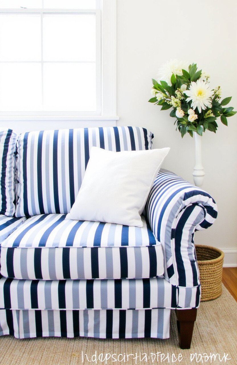 Reupholstering furniture with navy striped fabric can breathe new life into old pieces. It’s like getting new furniture without the cost.