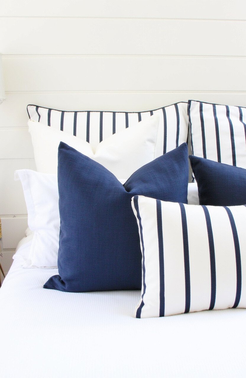 Throw pillows are a simple way to introduce navy blue stripes into your living room or bedroom. They’re like a mini makeover for your sofa or bed.