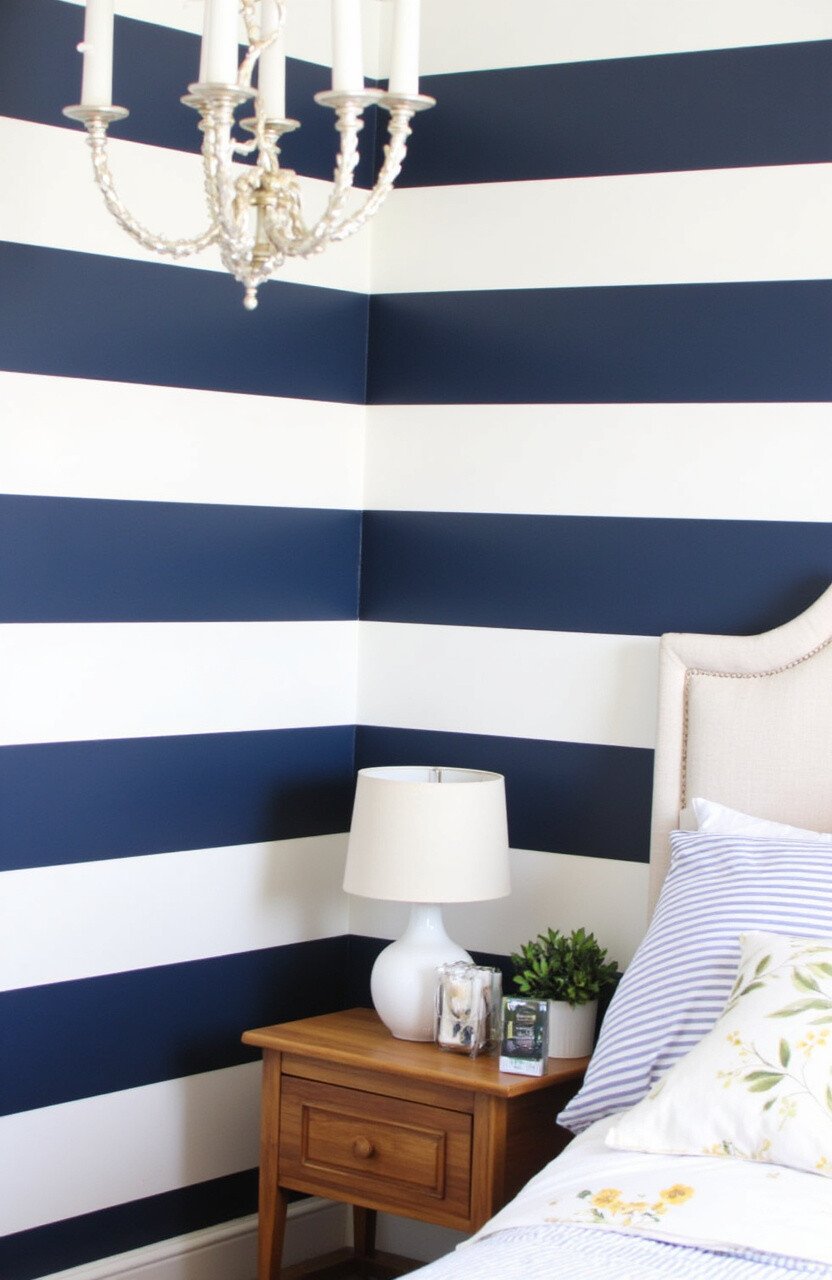 Painting an accent wall with navy blue stripes can drastically change the vibe of a room. It draws attention and adds depth, making a small room feel much larger.