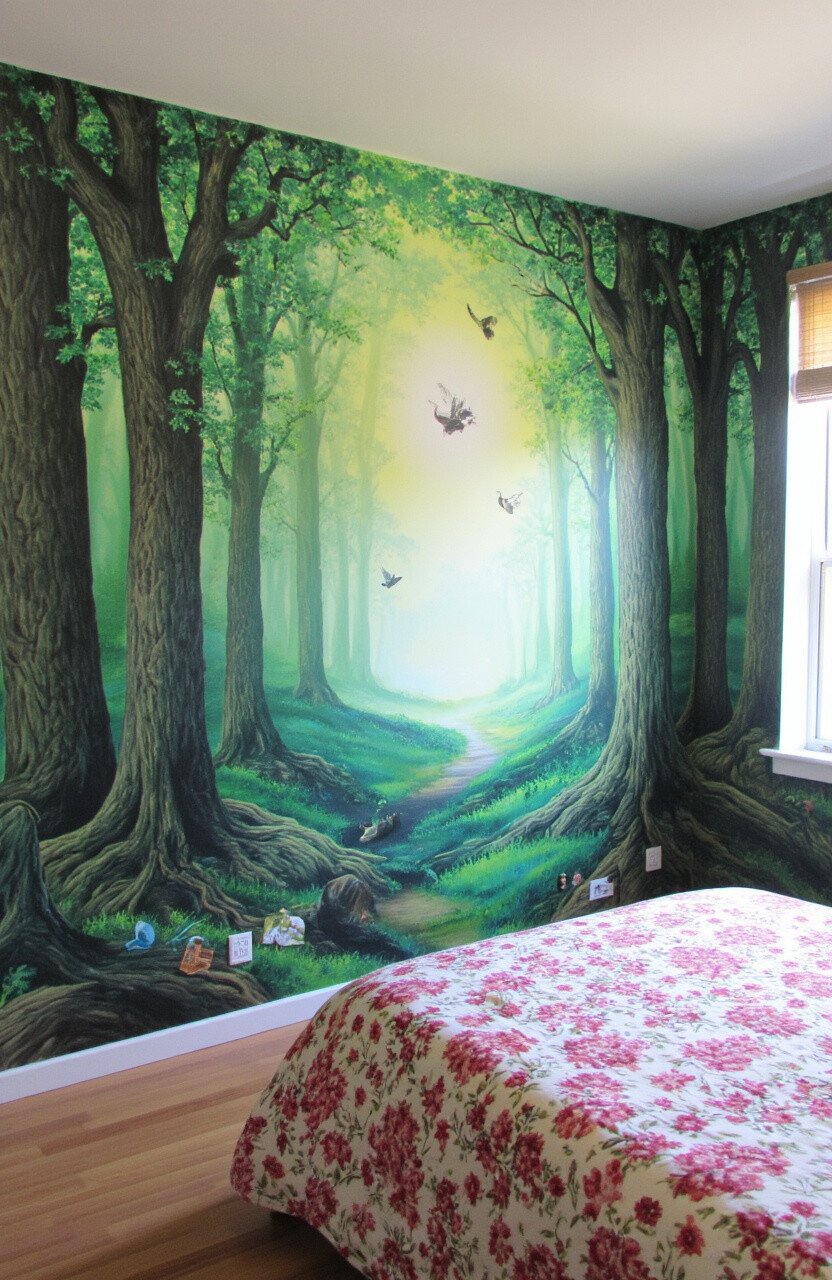 Transform a plain wall into an enchanted forest. Use wall decals or murals to create trees, wildlife, and a hint of mystery.