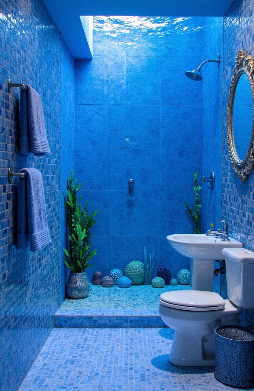 Dive into an underwater escape with a bathroom that feels like an ocean. Think of azure blues, shimmering tiles, and aquatic creatures peeking from the walls.