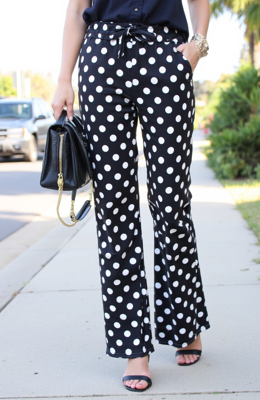Ready to make a statement? Bold polka dot pants are the way to go. They’re perfect for days when you want your outfit to do all the talking. Imagine strutting down the street with confidence in these eye-catching trousers.