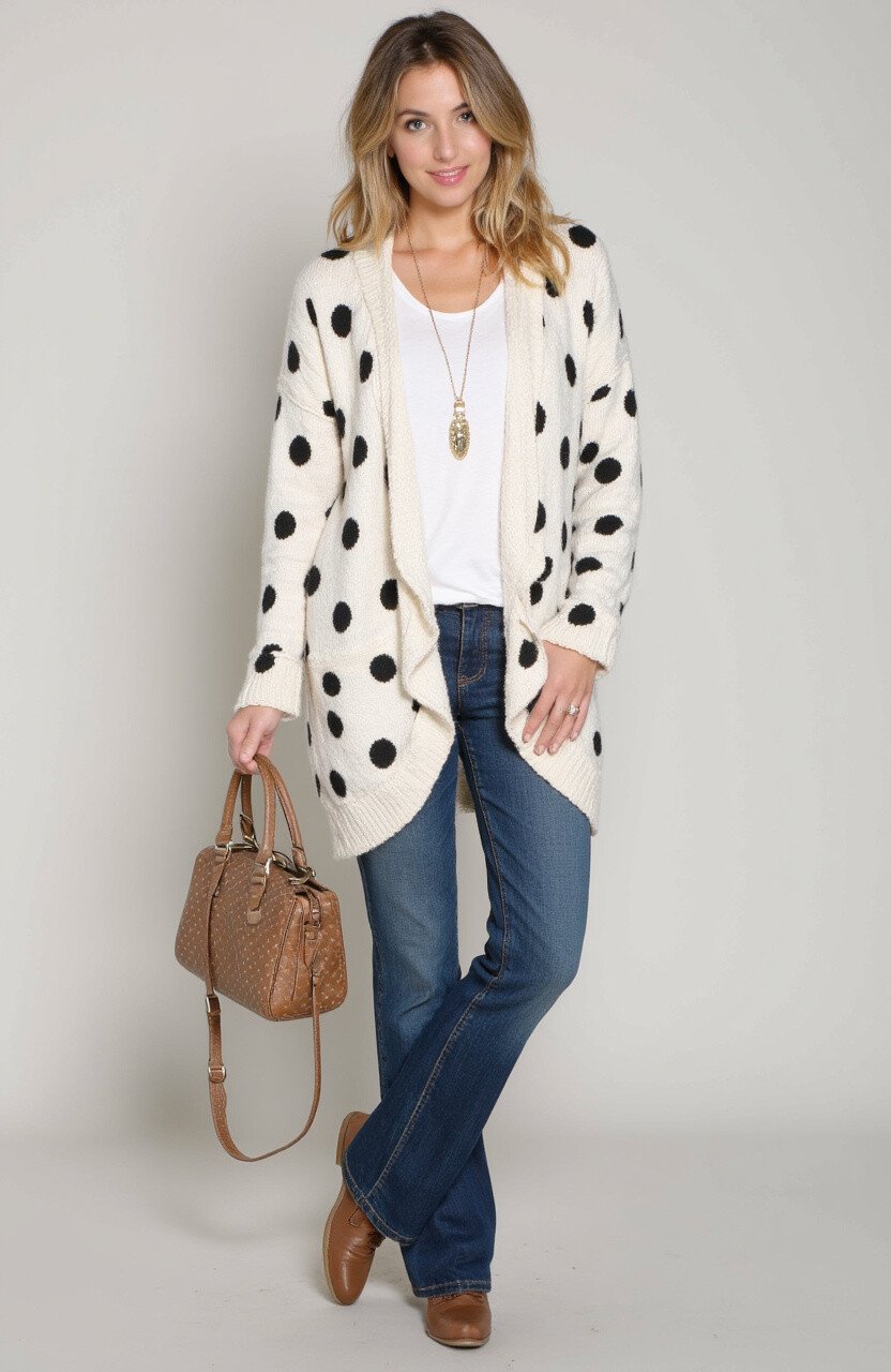 Keep cozy and cute with a polka dot cardigan. It’s the perfect layering piece for any outfit, whether you’re wearing jeans, a dress, or a skirt. Imagine snuggling up in it on a chilly day, looking stylish yet comfortable.
