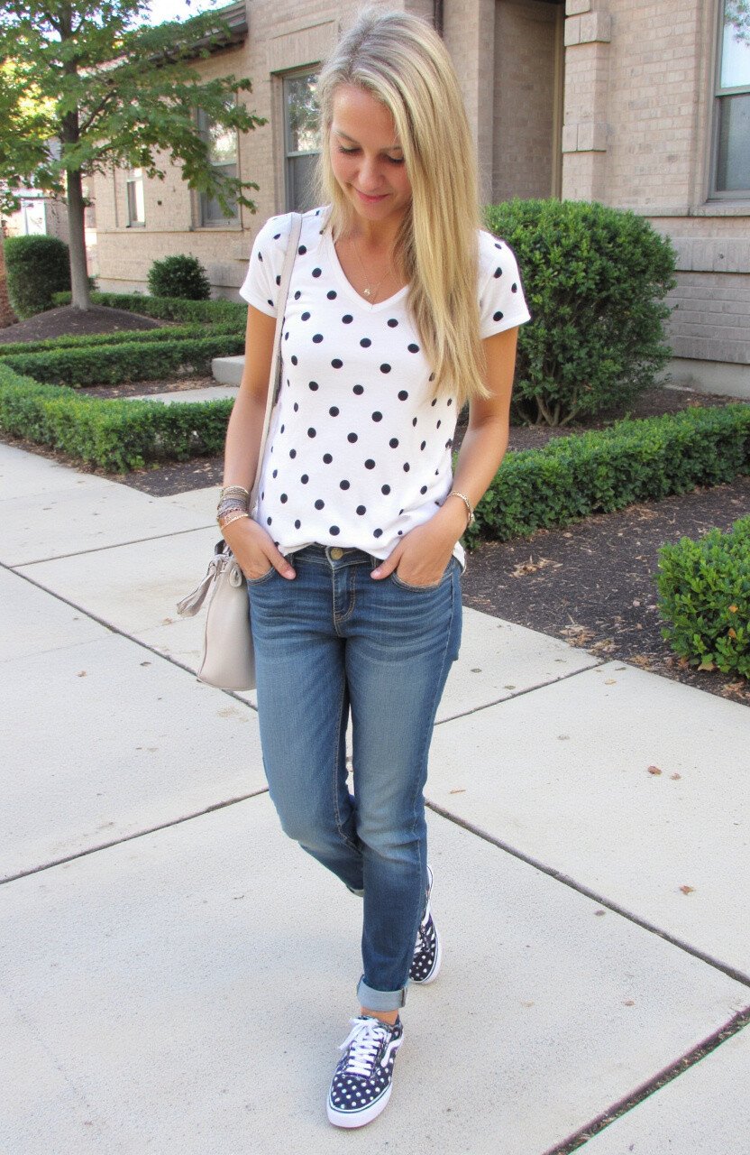 Pair them with a solid color top to let the dots shine. Tip: Look for styles with elastic waistbands for added comfort. Often, you can find these at affordable prices at chain stores or online.