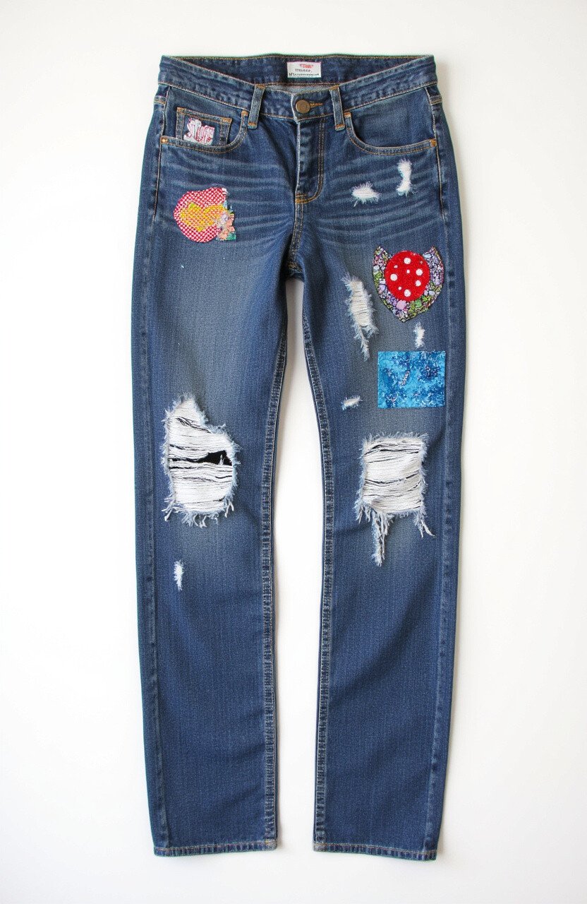 Revamp your old jeans with colorful patches. This idea is about sewing fun patches onto denim to cover holes or just for decoration. Each patch tells a unique story, making your jeans one of a kind.