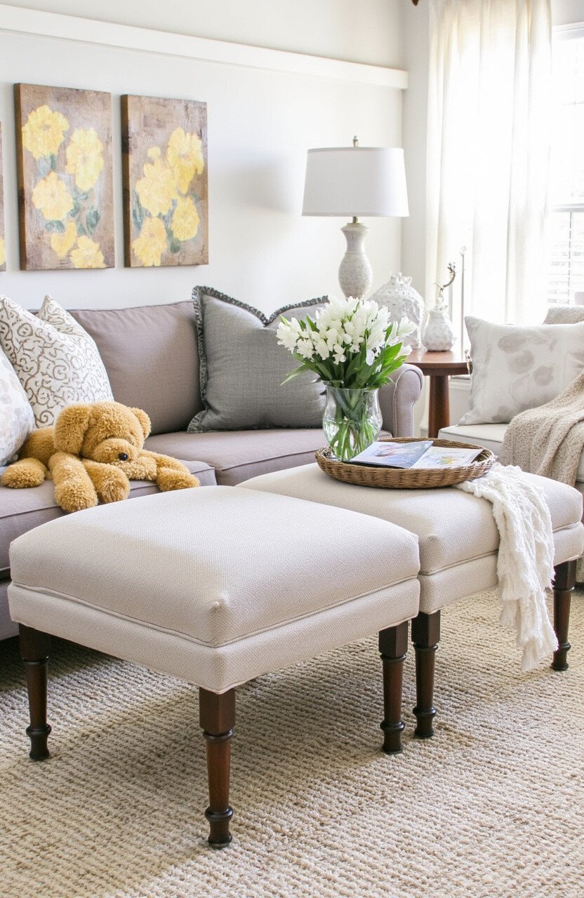 Add comfort and style to your living room with a pair of twin ottomans. They provide extra seating or a place to rest your feet, making them both functional and stylish. Place them in front of a sofa or under a console table.