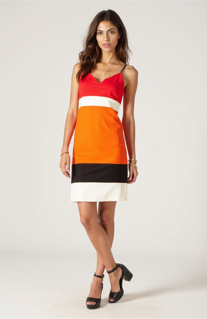 Color blocking is bold and eye-catching. A slip dress with contrasting colors is modern and stylish.