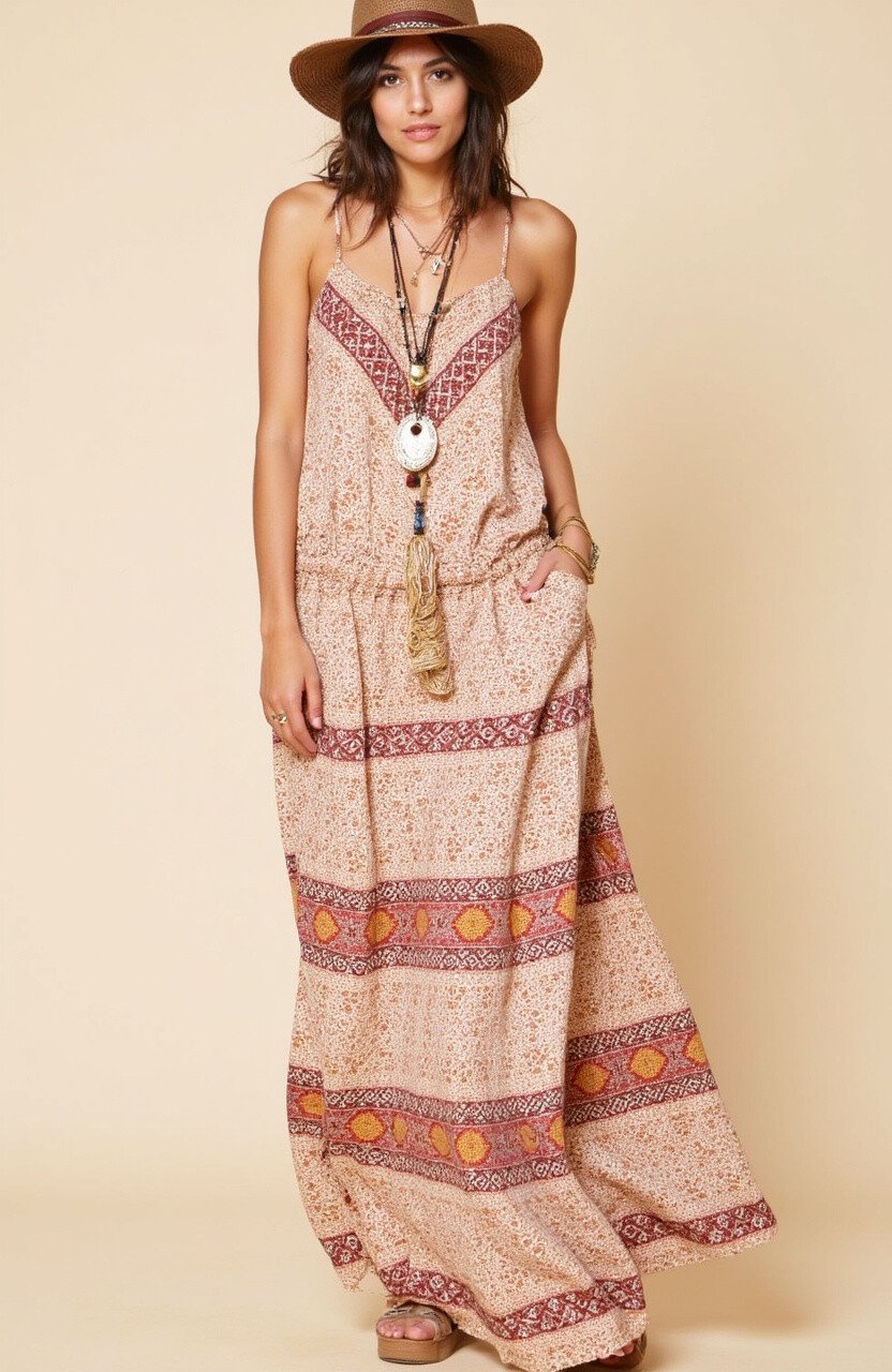 This boho-inspired slip dress is all about free-spirited charm. With flowing lines and earthy tones, it’s perfect for festivals or a beach getaway.