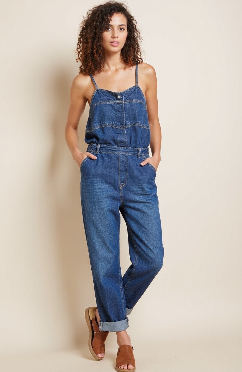 A denim jumpsuit with spaghetti straps is the perfect blend of casual and cool. It’s unique, trendy, and easy to style.