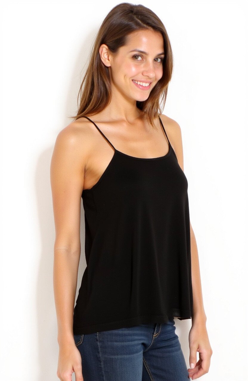 A sleek black spaghetti strap top is like a magic wand in your wardrobe. It goes with everything and anything.