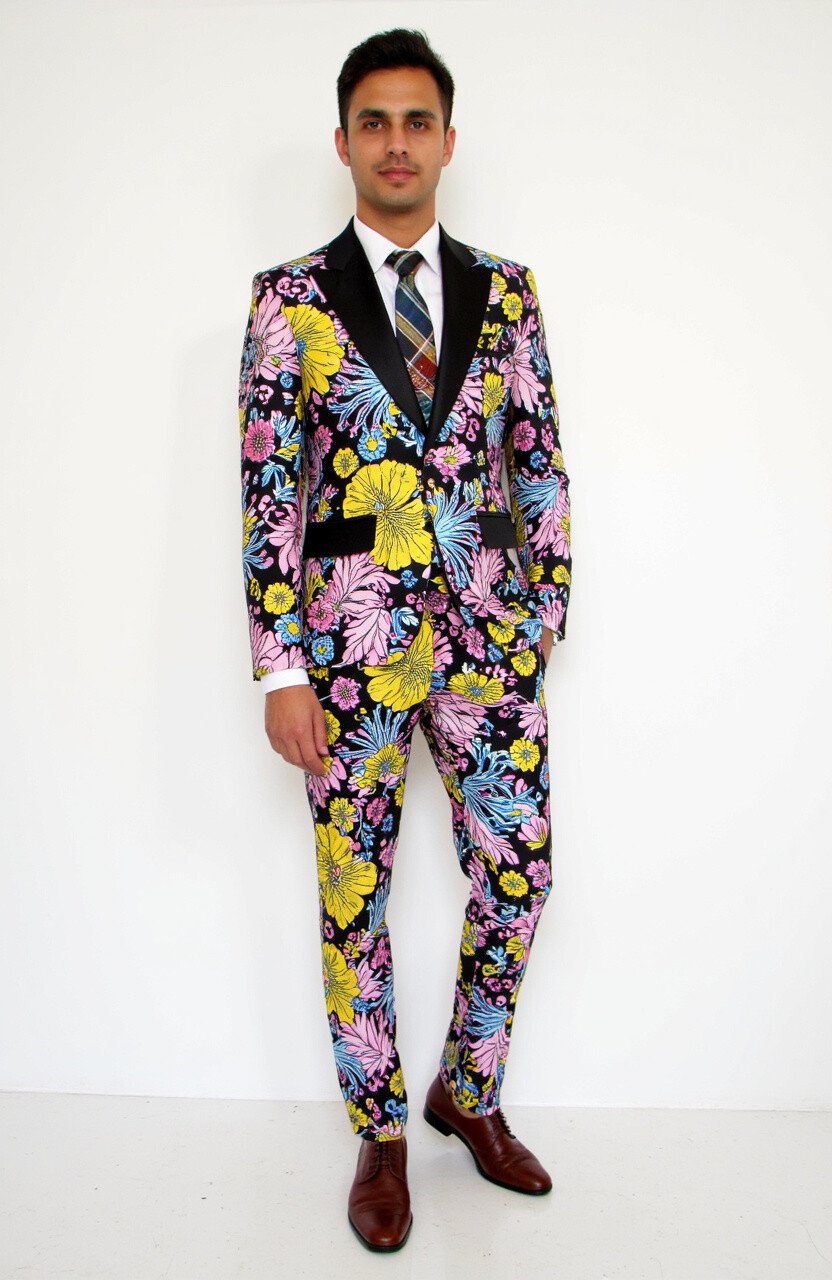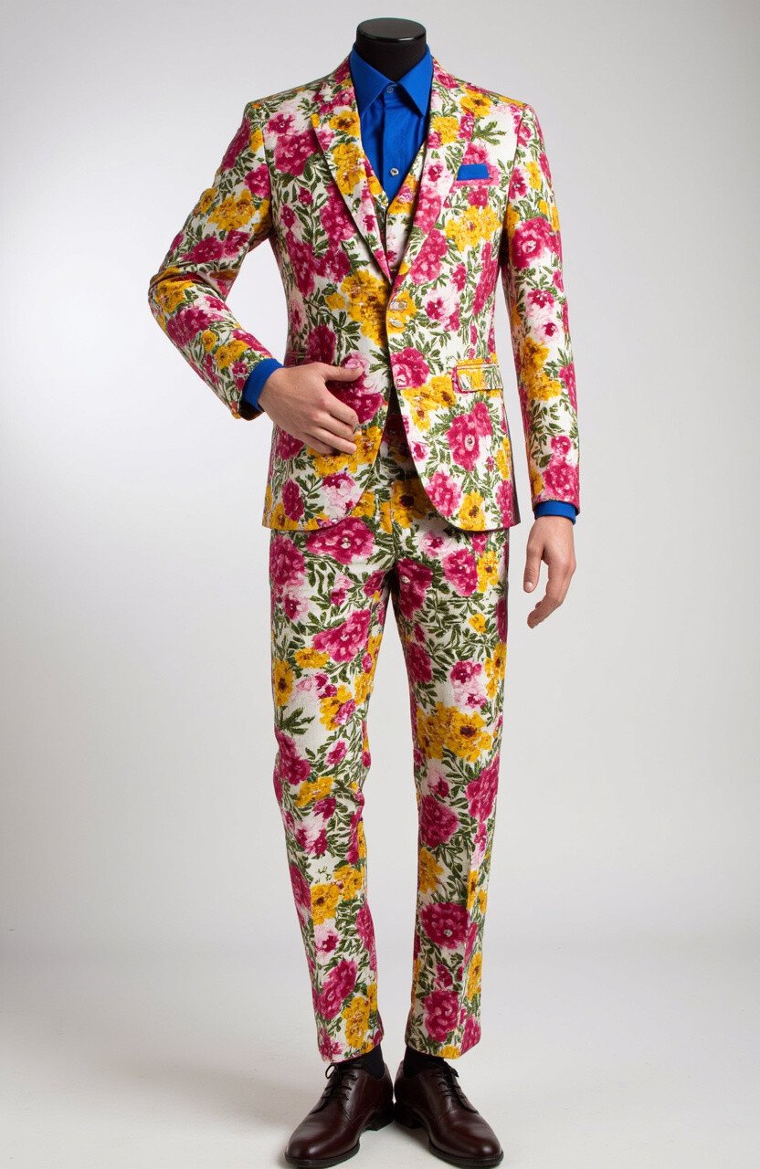 Florals aren’t just for spring; they’re for making a bold statement all year round. A suit covered in large, vibrant flowers can brighten any room.