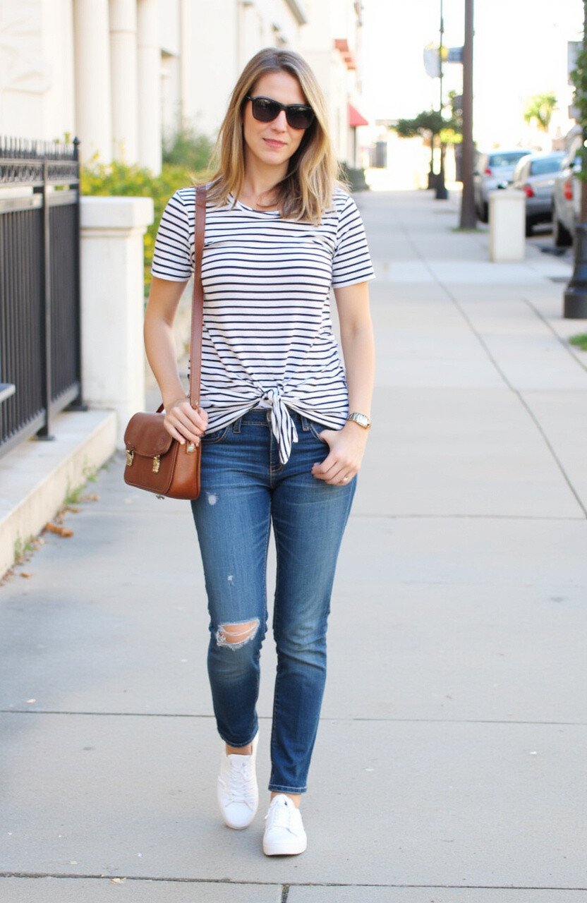 Channel a nautical theme by pairing your striped top with white shorts and boat shoes. This look is perfect for a day by the sea or a summer picnic. The combination of stripes and whites is fresh and classic.