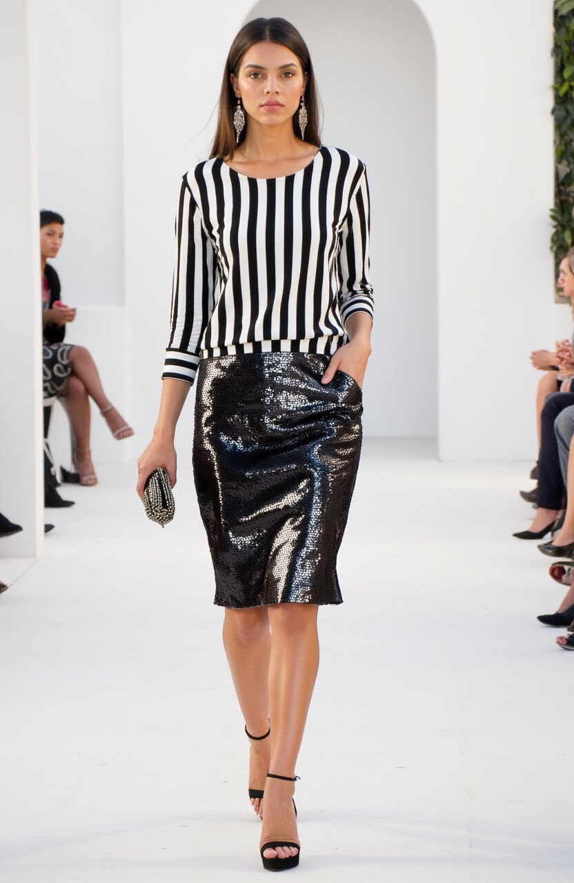 Make your striped top evening-ready by tucking it into a sequin skirt. This glamorous look is sure to turn heads at any party or special event. The contrast between stripes and sequins is bold and eye-catching.