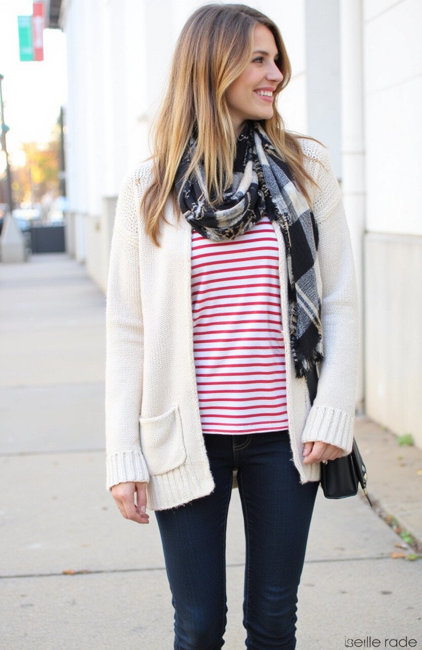 When it’s chilly, layer your striped top under a chunky knit cardigan. This cozy look is great for staying warm and stylish. The stripes peek out just enough to add visual interest.