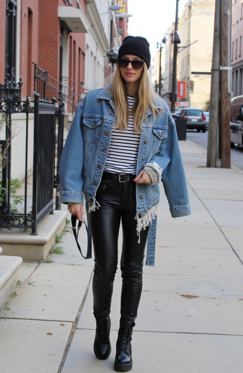 Get an edgy vibe by pairing your striped top with leather pants and a denim jacket. This street style look is bold and trendy, perfect for concerts or nights out. The mix of materials creates a unique texture.