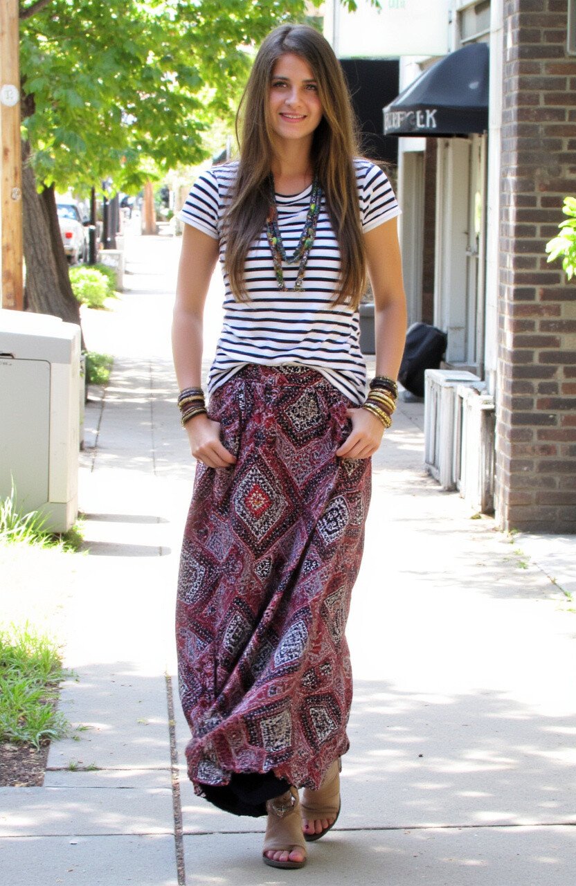 Embrace an artsy flair by combining your striped top with a patterned maxi skirt. This bohemian look is unique and full of personality. It’s perfect for art shows or creative gatherings.