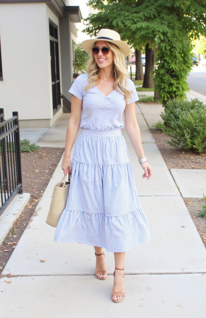 For a relaxed brunch look, pair your striped top with a flowy midi skirt. This combination is breezy and comfortable, perfect for a laid-back morning with friends. The stripes add a touch of fun to the outfit.