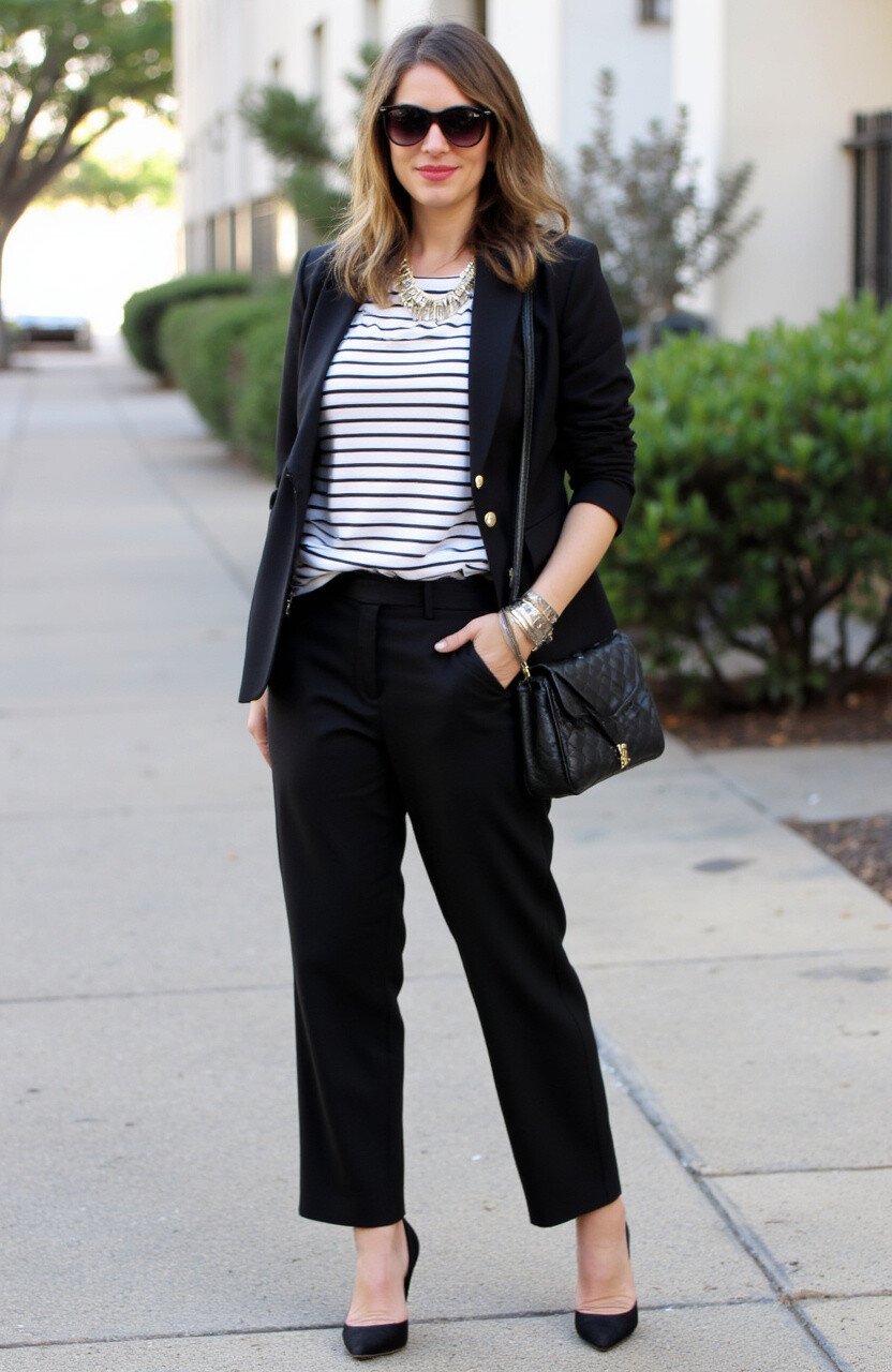 Create a sleek look by pairing your striped top with black trousers and a black blazer. This monochrome style is sophisticated and modern. The stripes add just the right amount of interest.