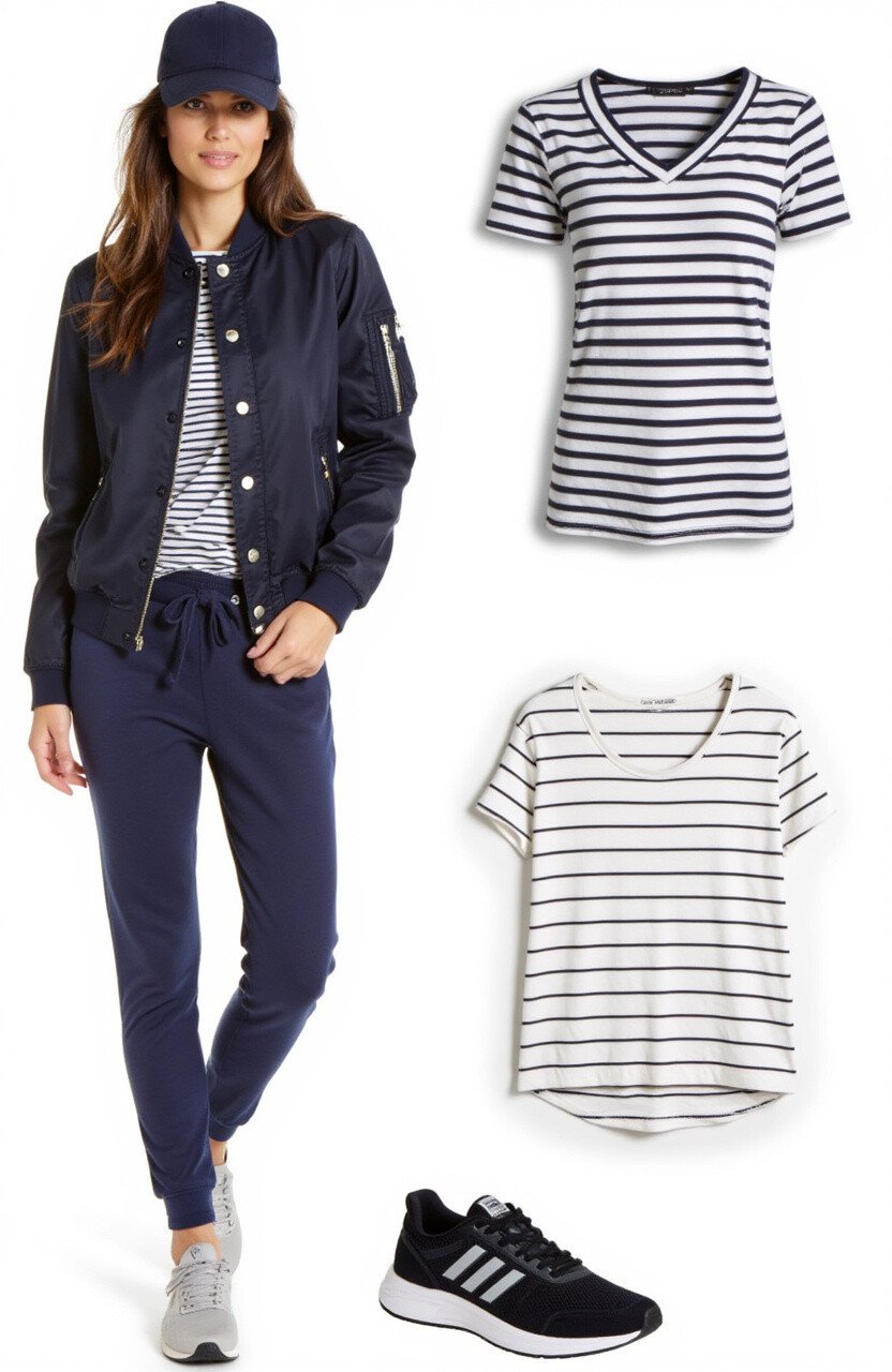For a sporty look, team your striped top with joggers and a bomber jacket. This combo is perfect for running errands or a casual hangout with friends. The stripes give a nod to classic athletic style.
