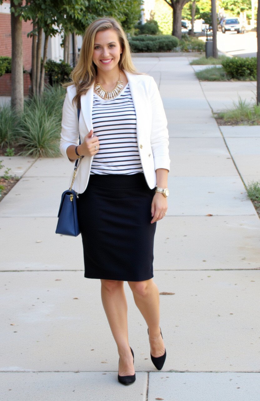 Turn your striped tee into office chic by pairing it with a tailored blazer and pencil skirt. This mix of casual and formal elements creates a balanced, stylish ensemble. The stripes add a playful touch to your professional attire.
