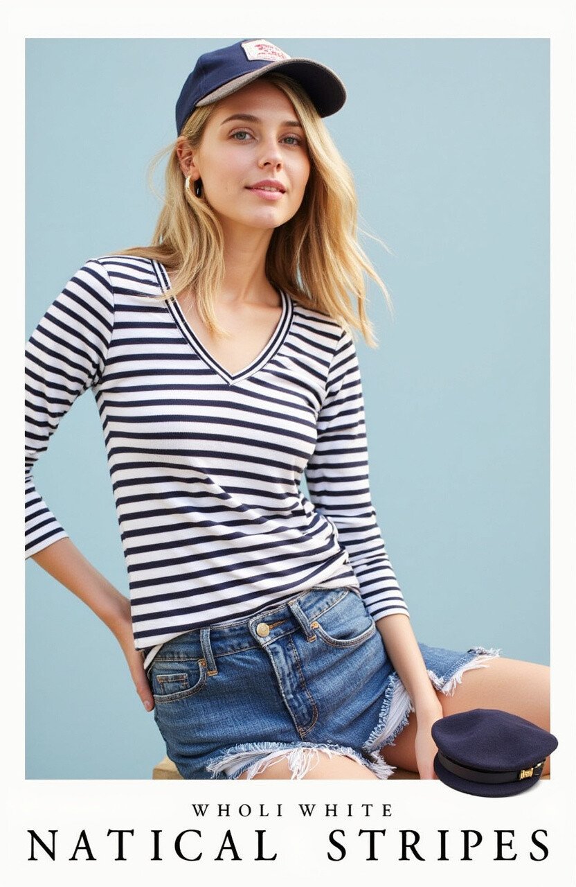 Set sail with the timeless appeal of nautical stripes. This look is all about crisp lines and the classic combination of navy and white.
