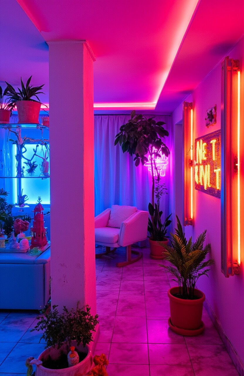 Use neon accents sparingly for a modern touch. Try neon lights or accessories to add a spark to your space.