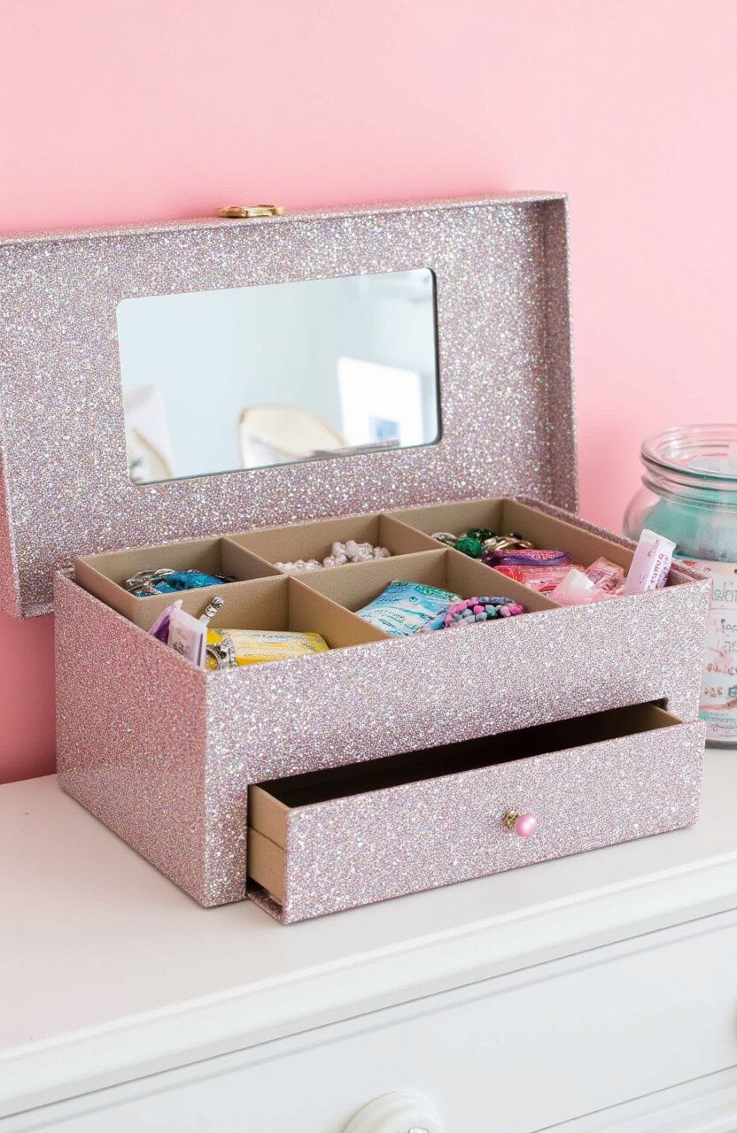 Consider using different colors of glitter for each compartment. This way, you can organize your jewelry by type or color and add a touch of sparkle to your daily routine!