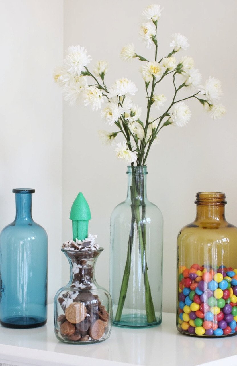Think of a row of jars with fairy lights inside or filled with colorful candies. They add a touch of whimsy and charm to any room.