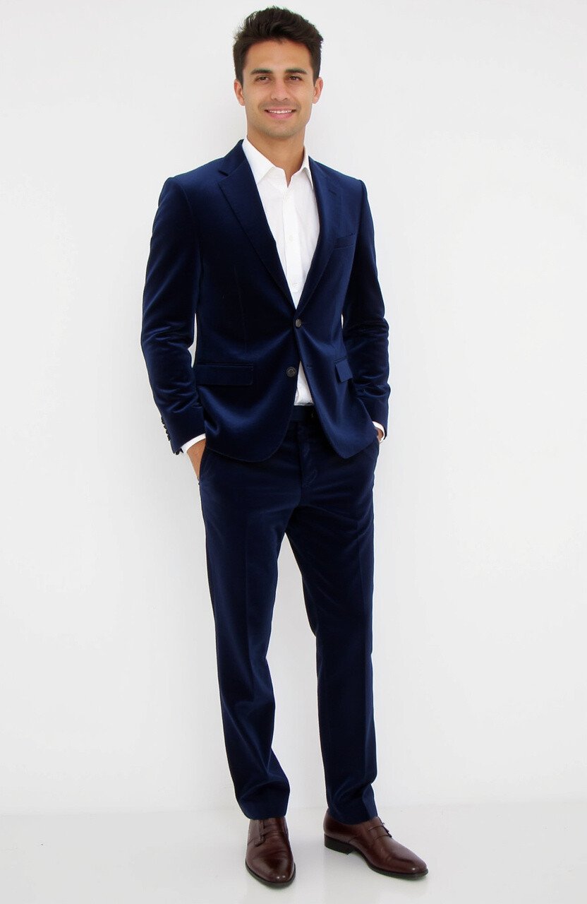 Imagine yourself wrapped in the deep, rich tones of midnight blue velvet. This suit is like wearing the night sky. The color is so enchanting, it almost feels magical.
