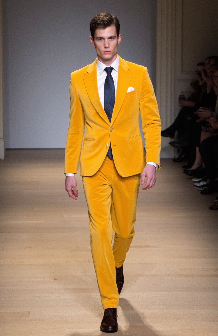 This suit is for those who love to stand out. The mustard yellow color is bright and full of energy.